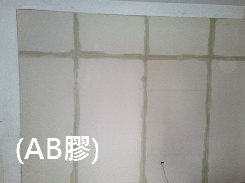 2. 牆面為矽酸鈣板或水泥板,須前一天先上AB膠,預防接縫處下陷,隔天壁紙師傅補土後才能貼作壁紙, (如下圖)